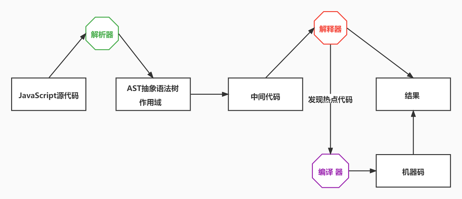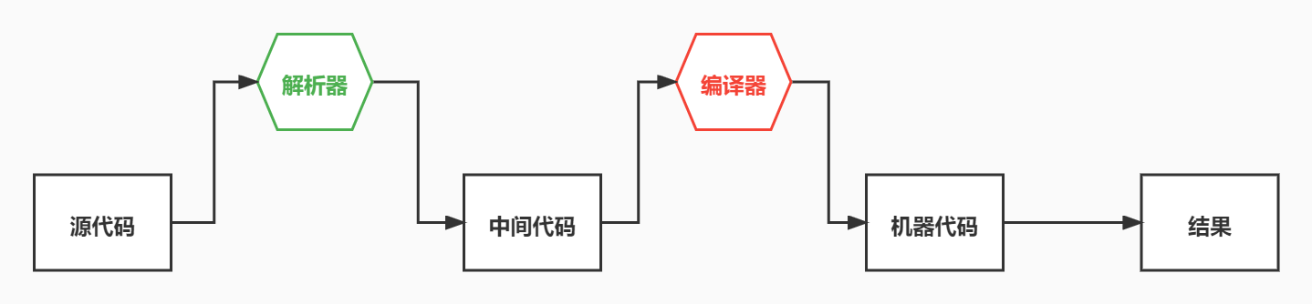 - 先将源代码通过解析器转成中间代码,再用编译器把中间代码转成机器码,最后执行机器码,输出结果
