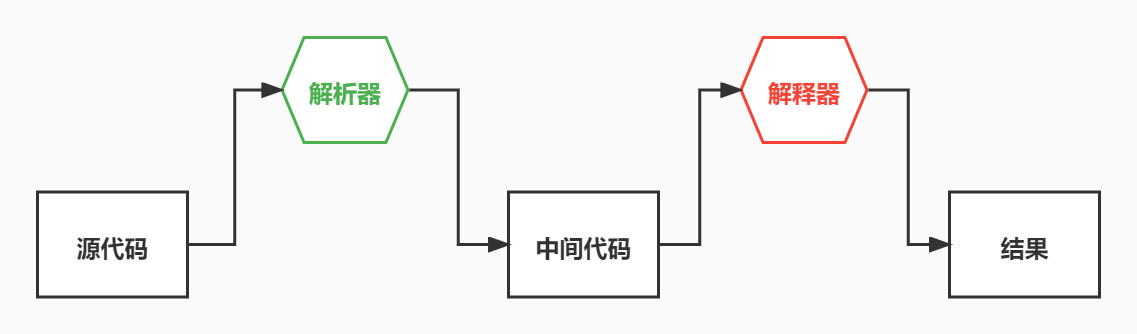 - 先将源代码通过解析器转成中间代码,再用解释器执行中间代码,输出结果