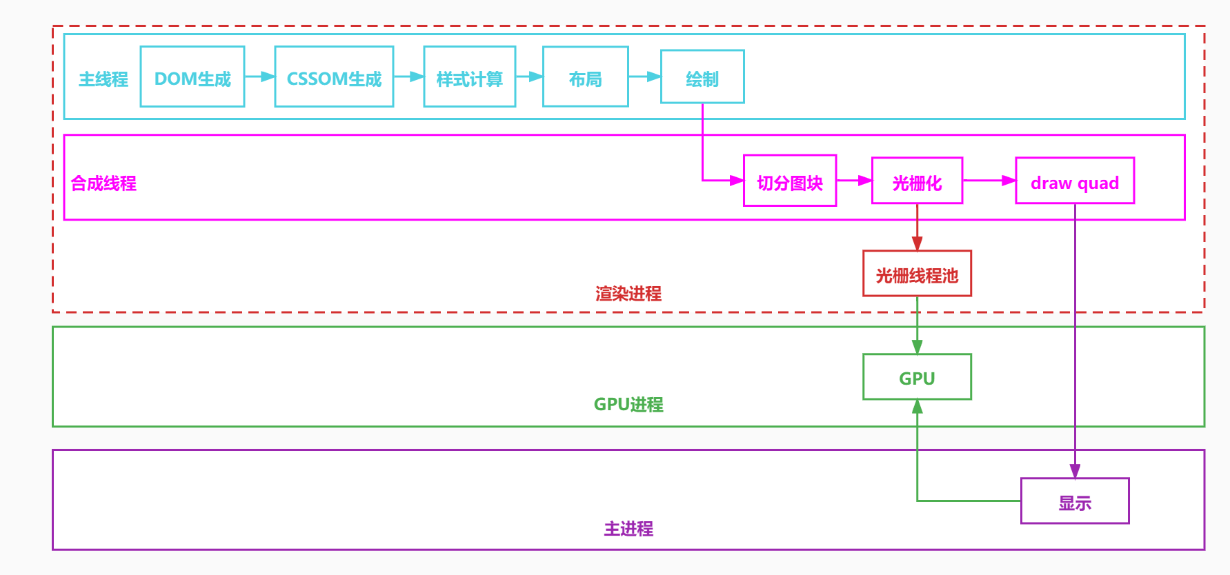 //13.当所有的图块都光栅化之后合成线程会发送绘制图块的命令给浏览器主进程
